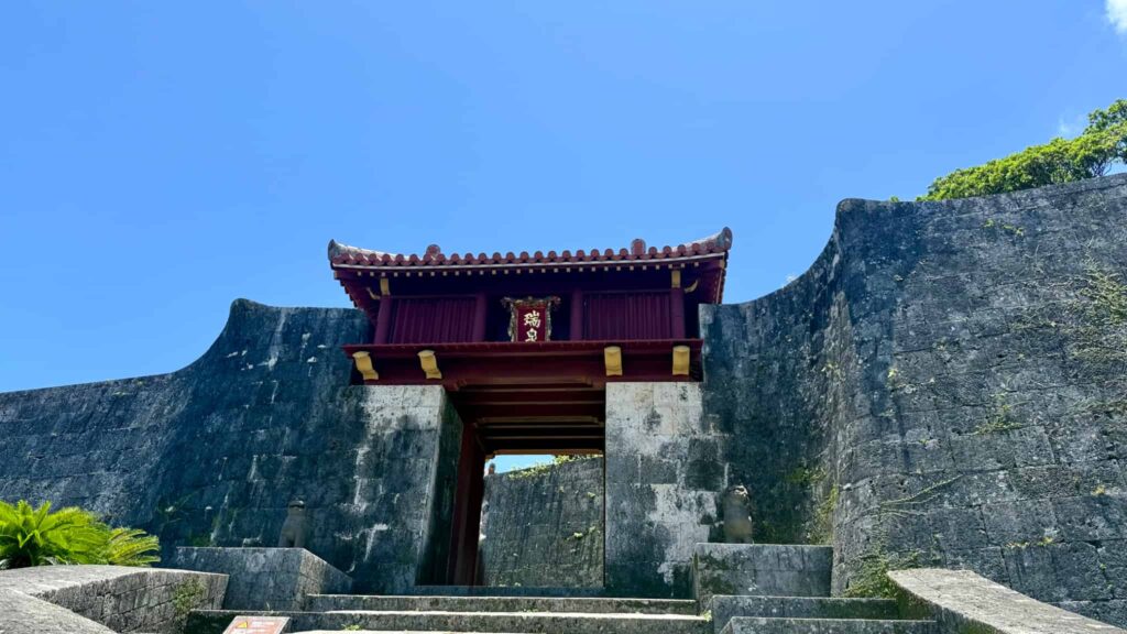 守礼門 (しゅれいもん)→ 歓会門(かんかいもん) → 瑞泉門 (ずいせんもん)→ 漏刻門(ろうこくもん) → 広福門(こうふくもん) → 奉神門 (ほうしんもん)→ 正殿と続きます。