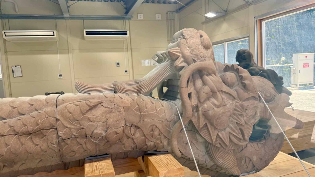 この大龍柱、火災の影響を受けながらも奇跡的に立っていたのですが、多くの損傷が確認されました。今は復元作業が行われる作業場に置かれていて、間近で見学することができます。