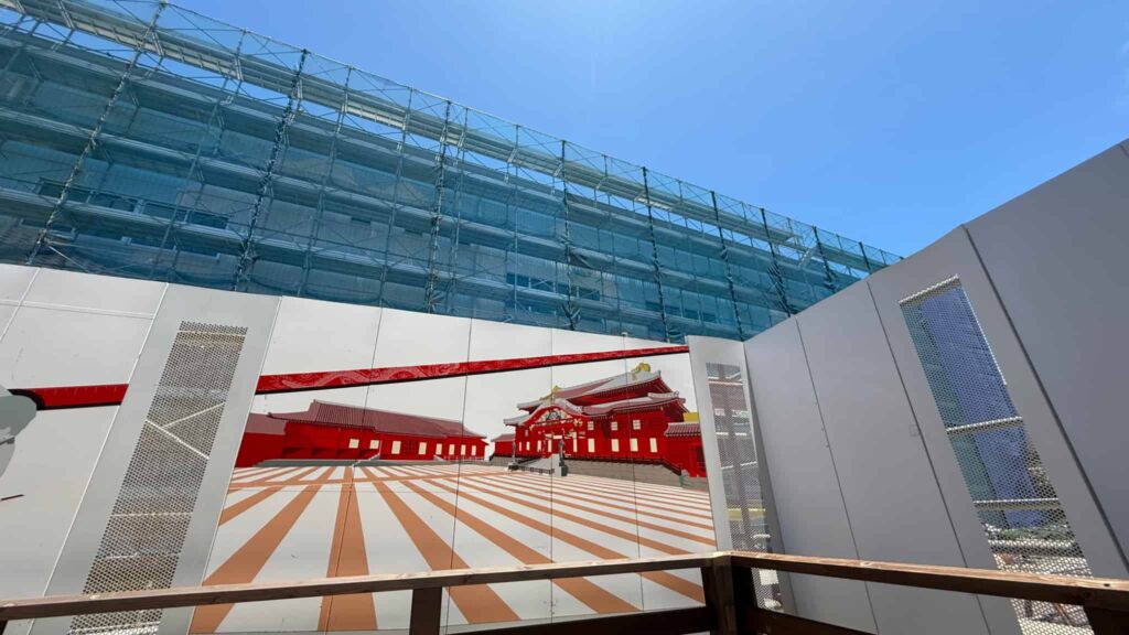 いまは、作業の建物に首里城正殿が描かれているけど、2026年には復元した綺麗なお城が見られるよ!楽しみだなぁ~