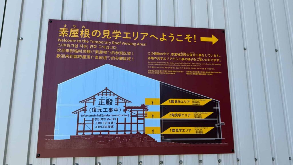 パネルに描かれた首里城正殿にしんみりしつつ進むと、「素屋根見学エリア」に到着しました。ここは、2025年6月8日までの期間限定公開でした。5月中にギリギリ見学できたのはラッキー。その先にある「首里城復興展示室」は、まだしばらく公開されているようです。