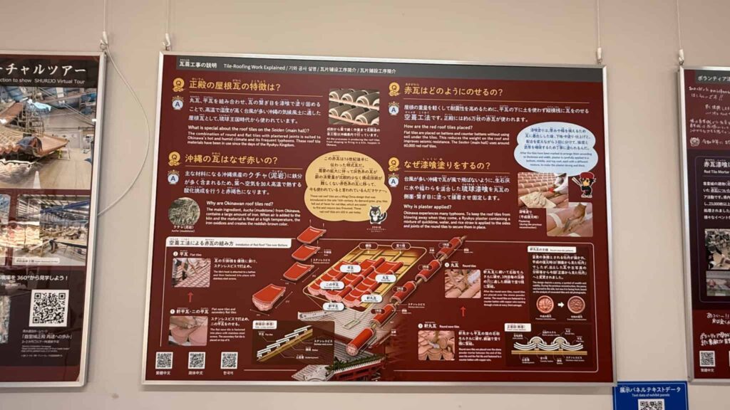 ガラス越しではありますが、屋根をこんなに近くで見られるのは貴重な機会でした。作業工程の説明パネルもあり、のんびり見学。正殿の特徴や赤瓦の組み方など、色々と勉強になります。