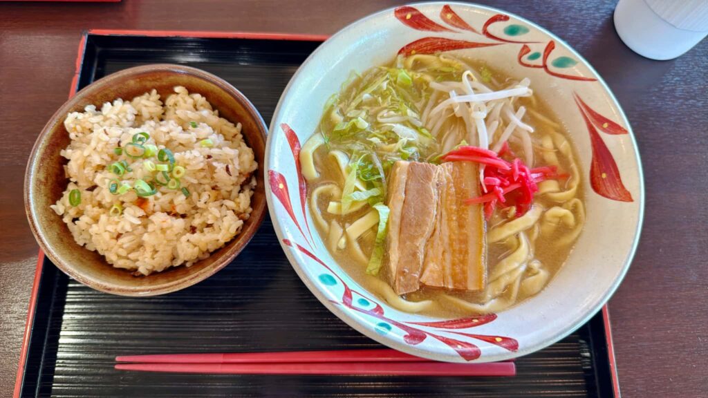 こちらは、私が注文した「首里の味噌 沖縄そば」&「じゅーしー」です。