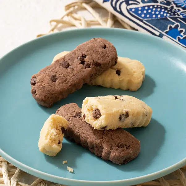 南風堂の職人さんの熟練技により、限界までチョコレートを加えながら、この独特の食感を維持しました。また、シークヮーサー味も登場。シークヮーサー果汁の入ったちんすこうにチョコレートチップを混ぜ込んだ、爽やかな酸味と苦み、チョコレートの甘さの絶妙なバランスがくせになる美味しさです。
