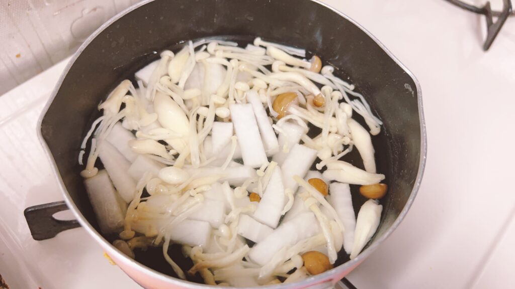 具材の野菜はお好みのものでOKです。今回は冷蔵庫に残っていた大根(2㎝程度)と冷凍ストックしていたきのこ(ひとつかみ程度)を使います。その他にも、玉ねぎやキャベツやわかめ等がおススメです。