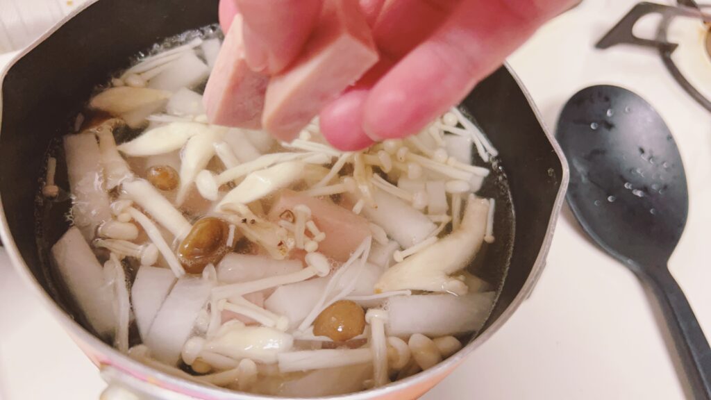 次に、鍋に水とだしの素を入れて軽く混ぜ合わせます。その中に野菜とポークを入れて火にかけます。