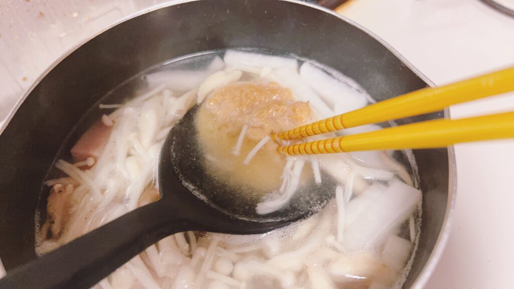 - 鍋に水とだしの素を入れて、だし汁をつくる